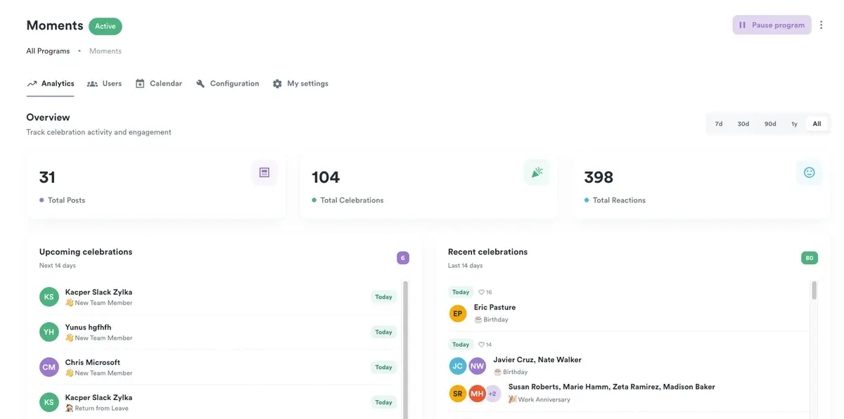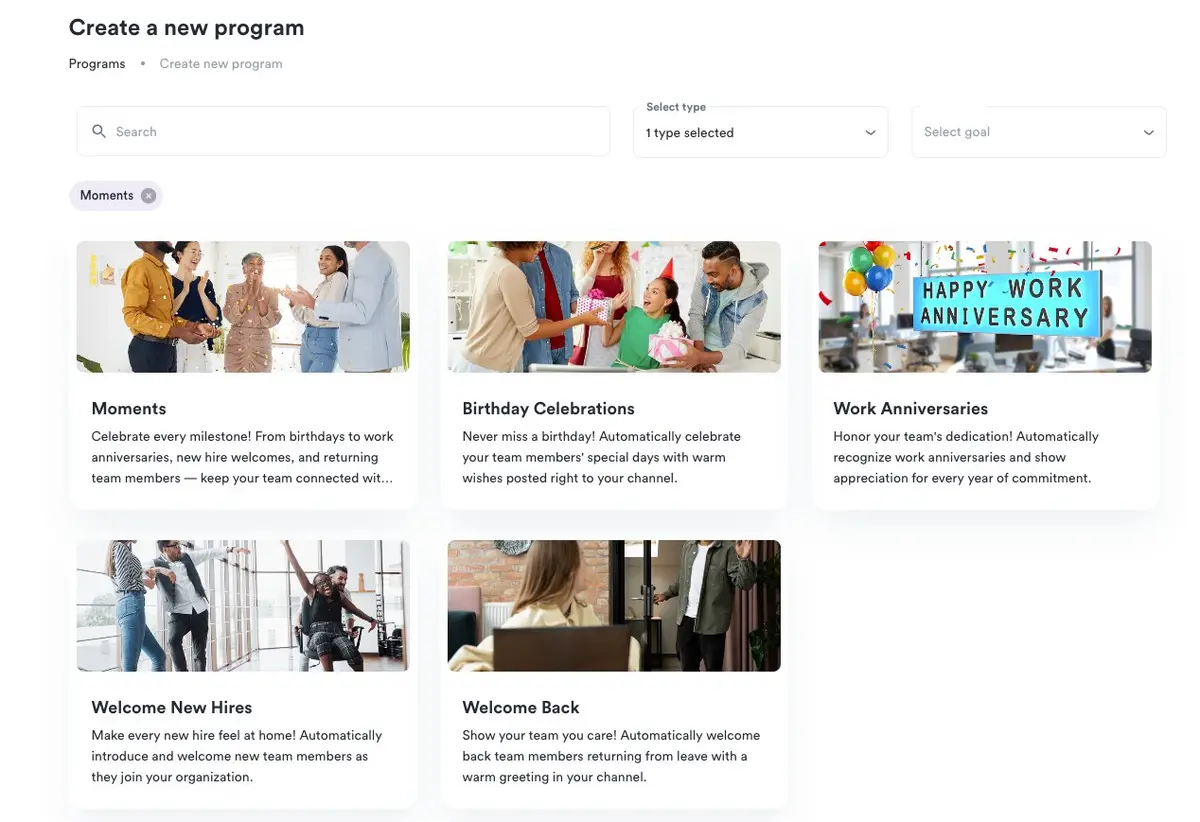 The biggest addition in this release is Moments — a brand-new program type that automatically recognizes and announces team milestones like birthdays, work anniversaries, and new hire welcomes.