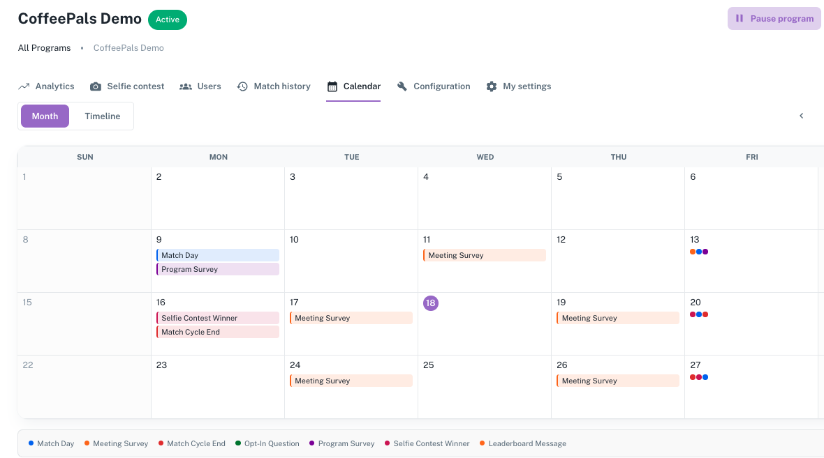 We've been busy making CoffeePals faster, more flexible, and easier to manage. This update brings a brand-new Program Calendar for admins, a completely reworked match team configuration experience, and major performance improvements across the dashboard. Here's everything that's new.