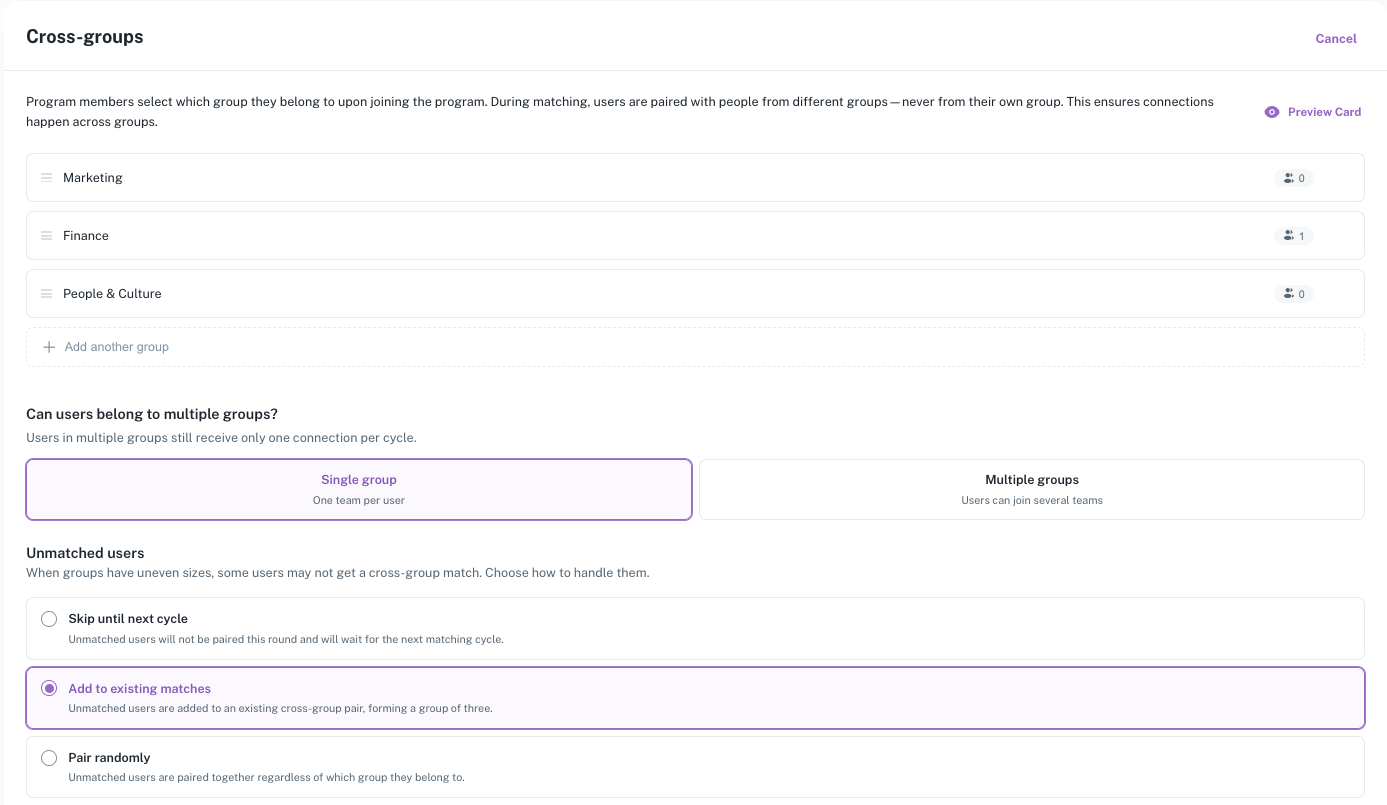 These changes apply to both cross-group and intra-group matching program types, giving admins full control over how teams are structured and matched.