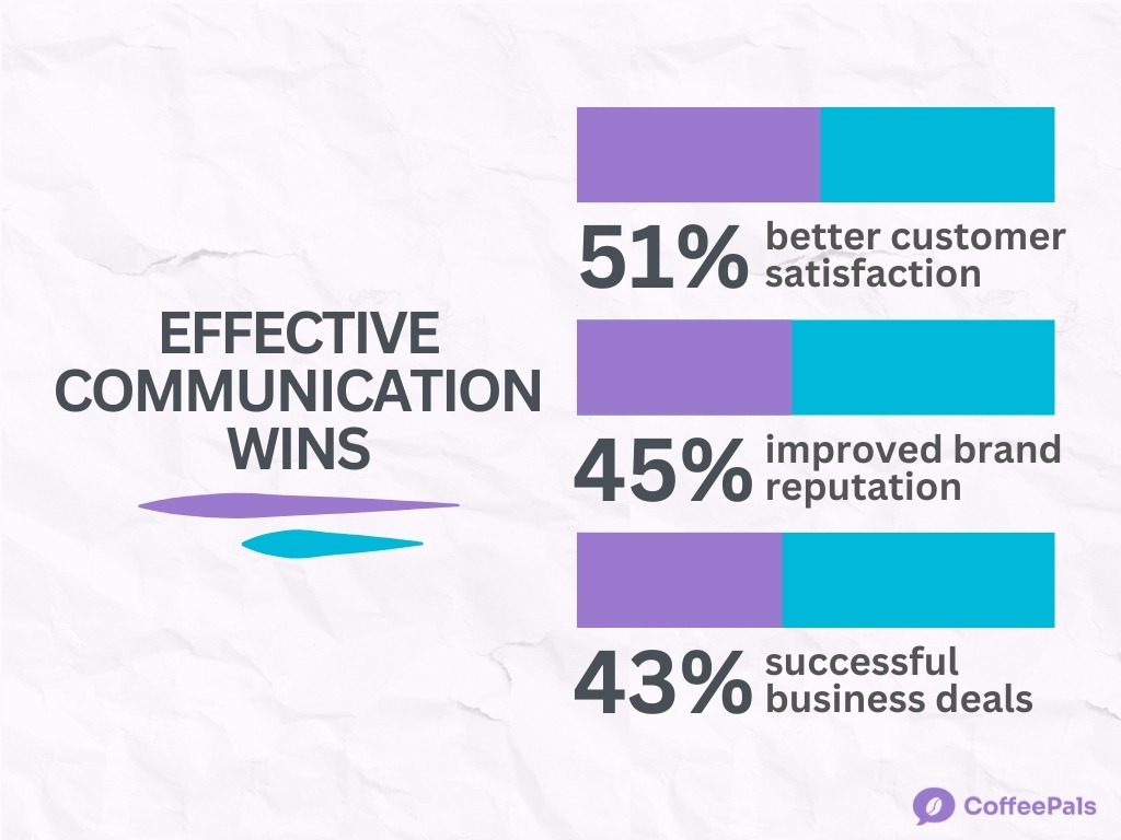 - Business leaders attribute the following to effective communication: 51% to heightened customer satisfaction, 45% to improved brand reputation, 43% to successful business deals, and 33% to cost reductions. (Grammarly, 2024)